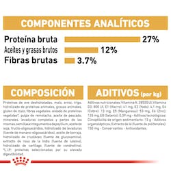 Composición: Proteínas de ave deshidratadas, maíz, arroz, trigo, hidrolizado de proteínas animales, grasas animales, gluten de maíz, fibras vegetales, aislado de proteínas vegetales*, pulpa de remolacha, aceite de pescado, minerales, levaduras completas y partes de las mismas, semillas e integumentos de psyllium, aceite de soja, fructo-oligosacáridos, hidrolizado de levaduras (fuente de manano-oligosacáridos), aceite de borraja, hidrolizado de crustáceo (fuente de glucosamina), extracto de rosa de la India (fuente de luteína), hidrolizado de cartílago (fuente de condroitina).