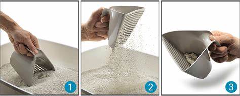 Pala limpiadora con asa superior que evita contacto directo con la suciedad. Cuchillas en forma de V para tamizado eficiente con menos polvo. Forma de cesta ergonómica para facilitar la limpieza de las esquinas del arenero.